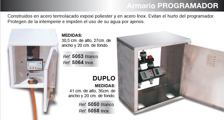 Construidos en acero termolacado epoxi poliester y en acero inox. Evitan el hurto del programador. Protegen de la intemperie e impiden el uso de su agua por ajenos.