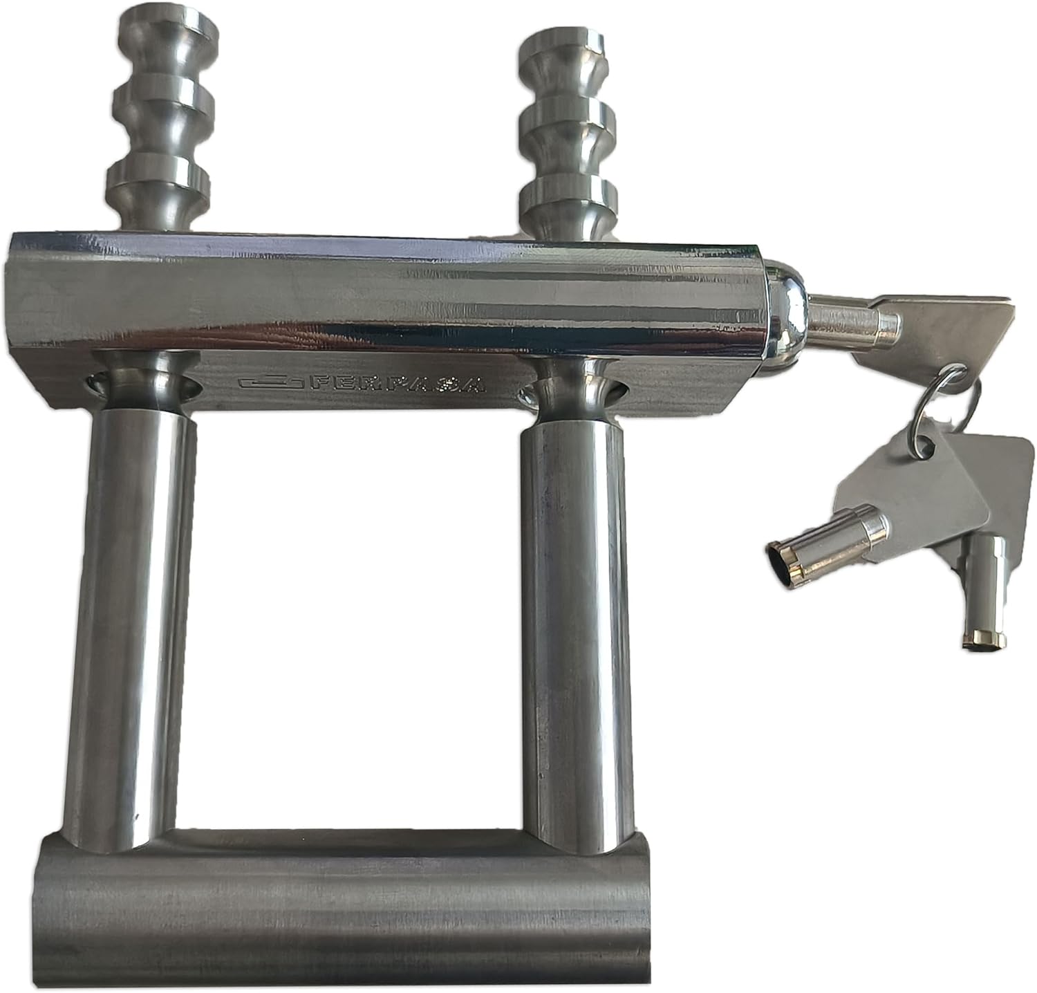 Candado de seguridad para Cierres extensibles y Cancelas. Cuerpo de latón cromado y Arco de acero inoxidable.