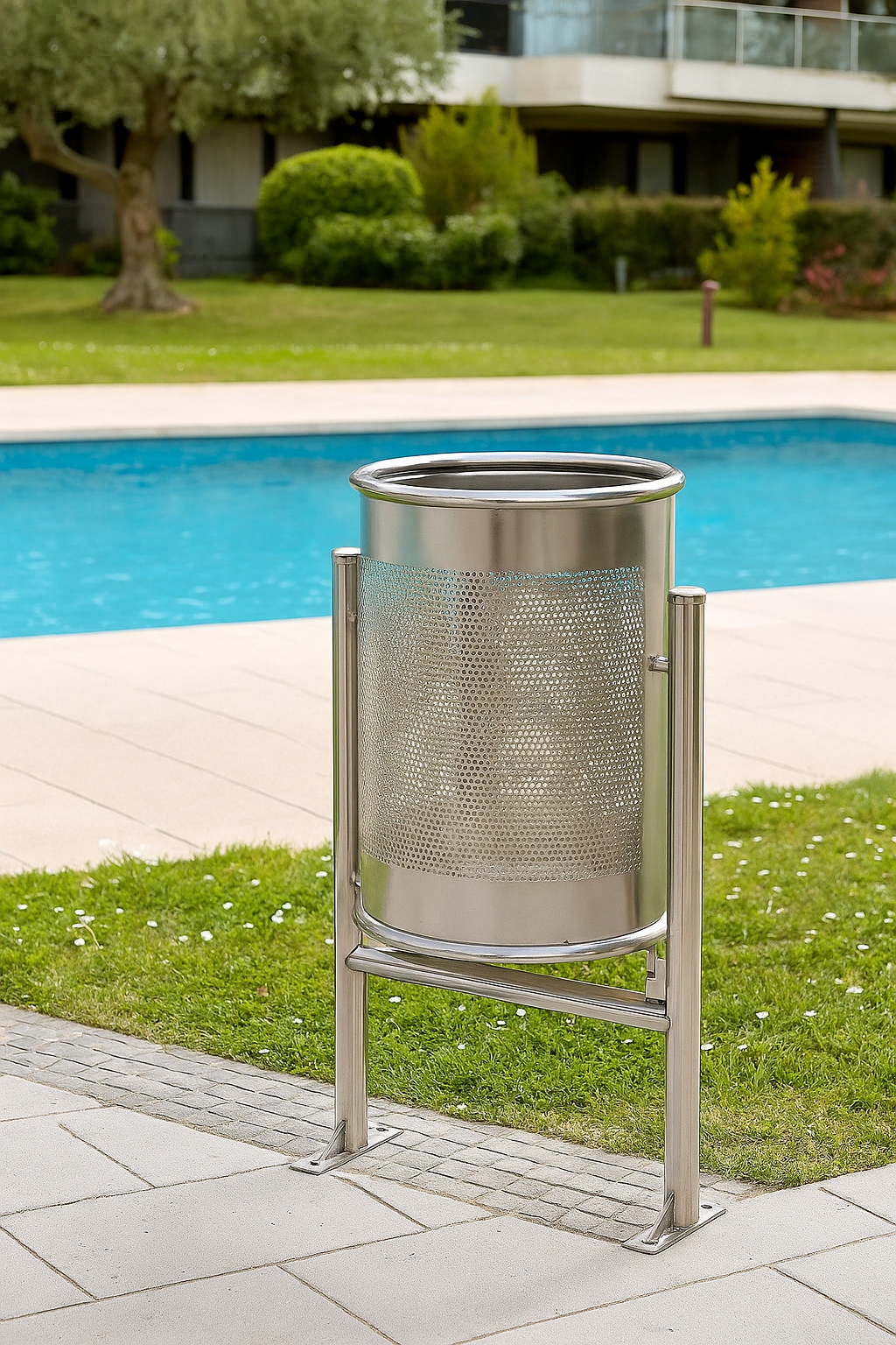 Con cesta abatible de acero inoxidable AISI 304 pulido brillante, apoyada en estructura de tubo de Ø40 mm con base de anclaje y pletinas rectangulares con dos agujeros de Ø12 mm para su fijación en el suelo.