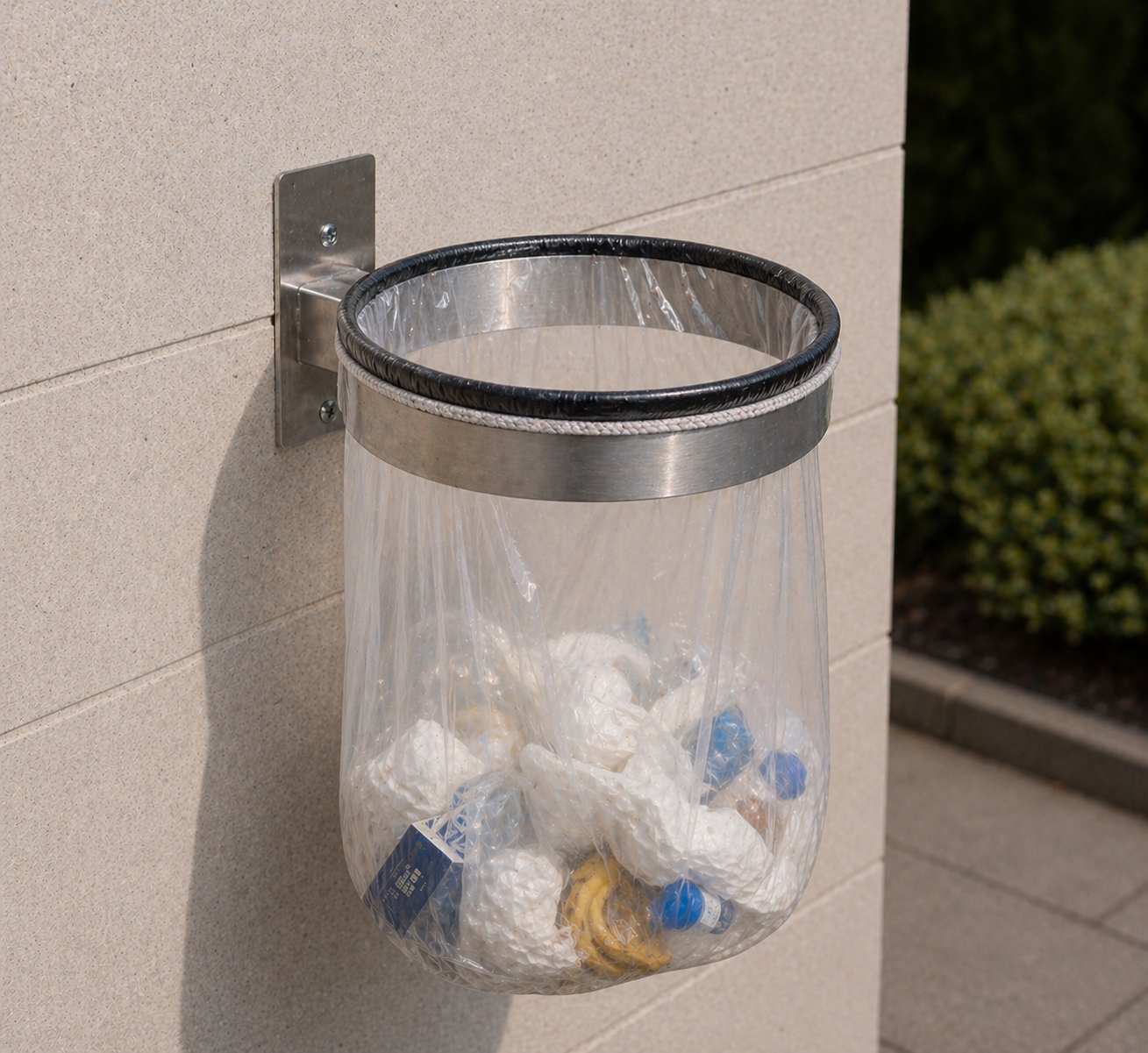 Soporte para bolsas de basura apto tanto para exterior como interior, adaptándose a diferentes espacios y necesidades.