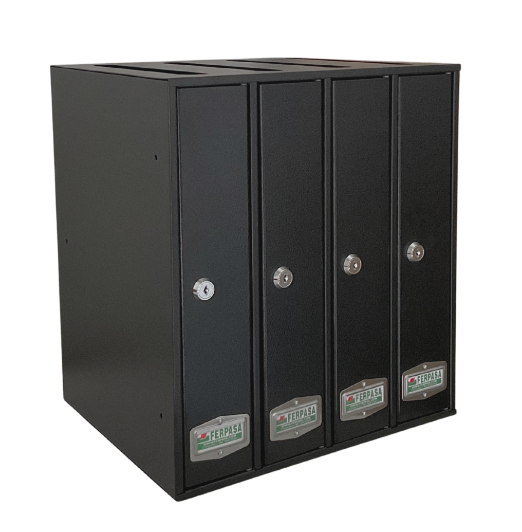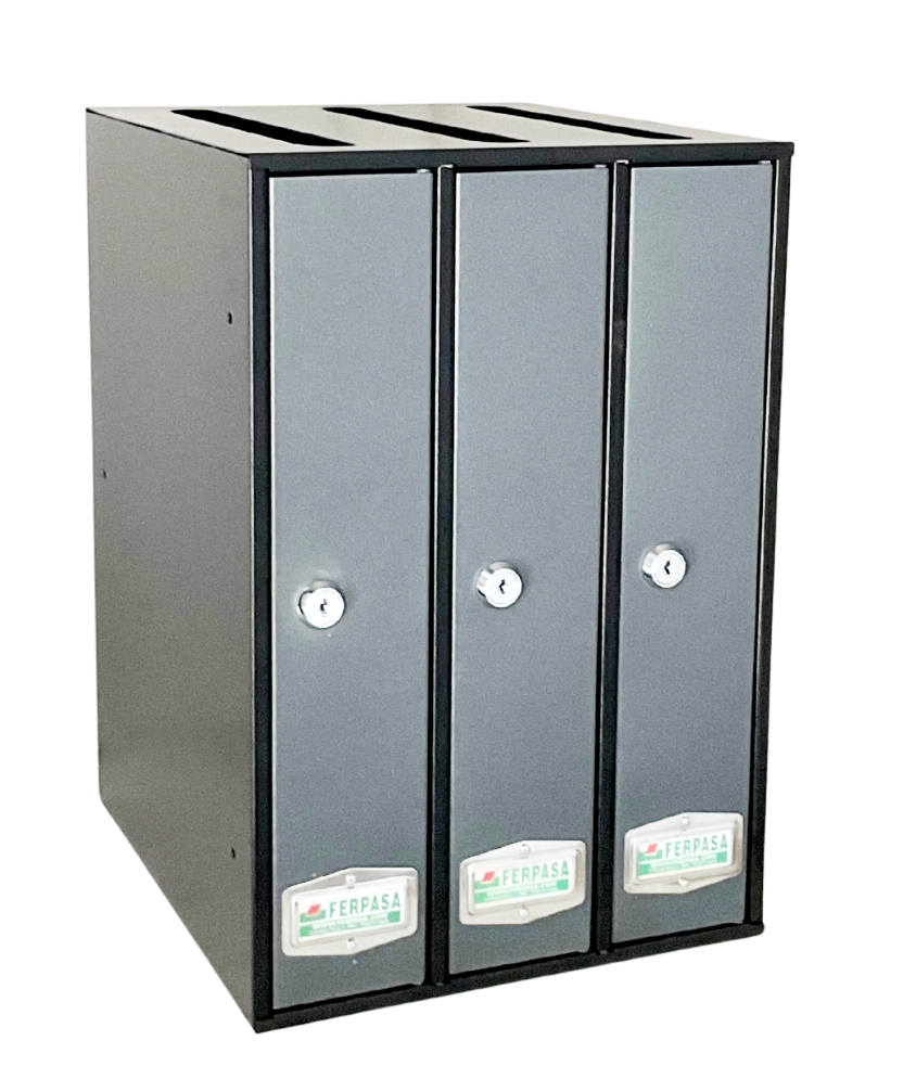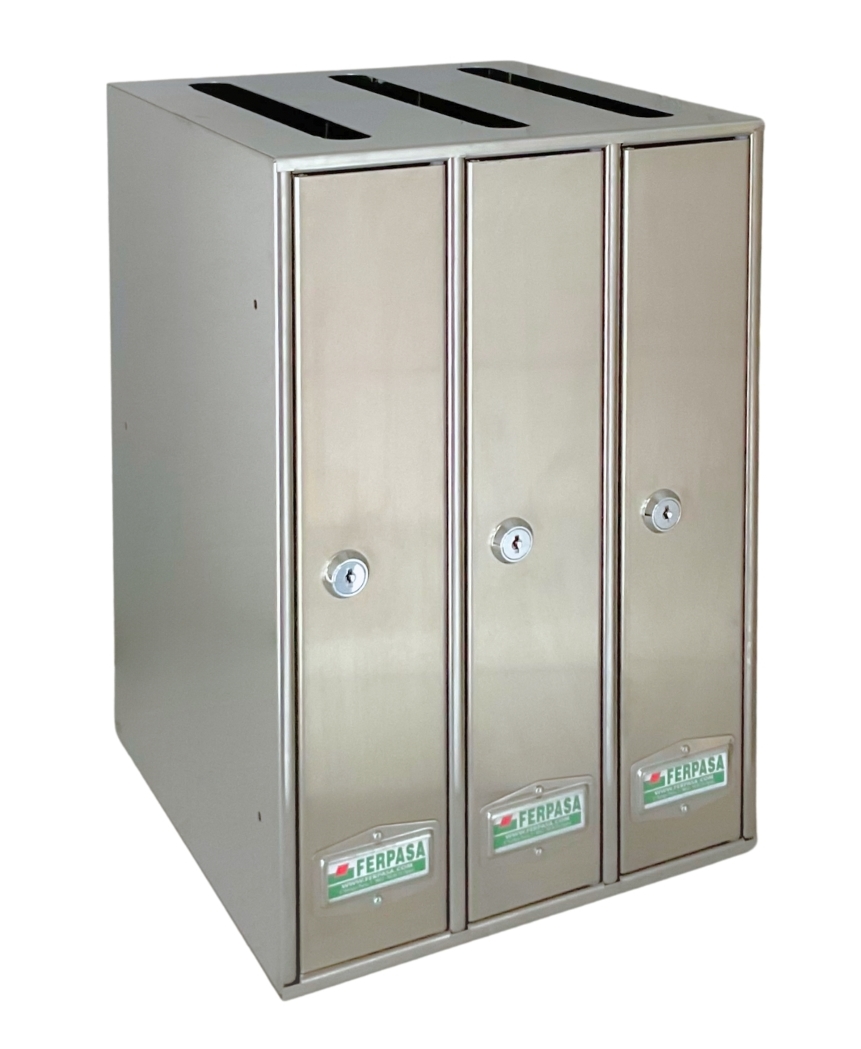 Se fabrica en módulos de 3, 4 y 5 uds. Se suministra con cerradura cromada con dos llaves y amplio tarjetero inox. de hasta 4 líneas perfectamente legibles.