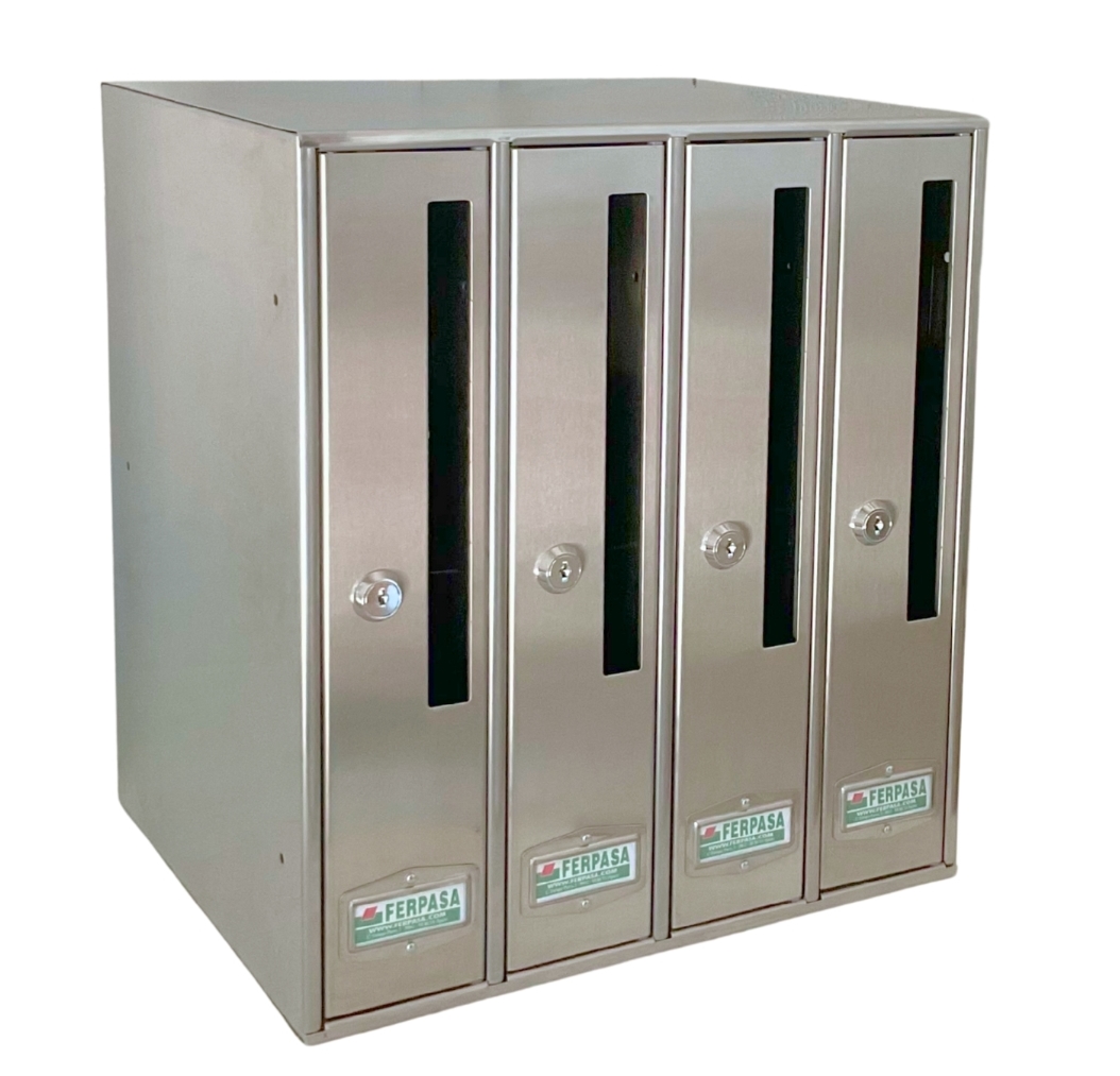 El buzón está disponible en módulos de 3, 4 y 5 ud. Se suministra con cerradura cromada y amplio tarjetero inox. de hasta 4 líneas perfectamente legibles.